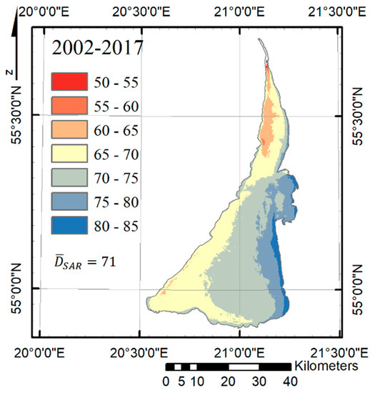 The analysis of satellite data presented above allowed, for the first time, to build up the spatially detailed ice season duration maps of the Curonian Lagoon for 2002–2017 (Figure 10 and Figure 11). Note that all the maps in Figure 10 and Figure 11 also contain the spatially‑mean ice season duration value, . The latter is usually lower than an overall ice season duration, , because of the changing ice cover properties (e.g., the multiple melting periods) during a single winter season over the different locations of the CL. Figure 10 shows a yearly-mean ice season duration map obtained by averaging all the satellite-derived ISD maps from the fifteen winter seasons in 2002–2017 (Figure 11).