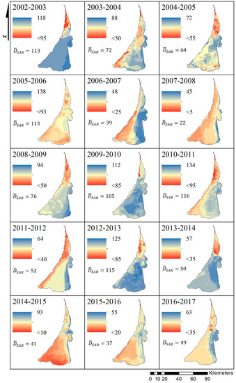 Figure 11 shows the ice season duration maps for every winter season in 2002–2017. To repeat shortly, the longest (shortest) ice season duration is observed in 2005–2006 (2007–2008). One can note that most often the lagoon is partitioned into two main parts in terms of the ice season duration. There are six winter seasons with a clear south–north asymmetry of this parameter in 2002–2003, 2004–2005, 2008–2009, 2009–2010, 2012–2013, and 2013–2014 with the northern part having a shorter ice season duration, and longer over the southern part. Yet, there are also another six years when this asymmetry has an east-west orientation (2003–2004, 2006–2007, 2007–2008, 2010–2011, 2011–2012, and 2016–2017) with a much longer ice season observed along the eastern coast of the lagoon. The most rarely occurring situation (2005–2006, 2014–2015, and 2015–2016) is when is low in the southwestern part of the lagoon and higher over the rest of it, including its northern part, usually having a shorter ice season. As seen, the noted reversal in the spatial properties of the ice season duration is observed mostly during the last years, and, perhaps, is attributed to the changes in the predominant wind conditions during the melting season.