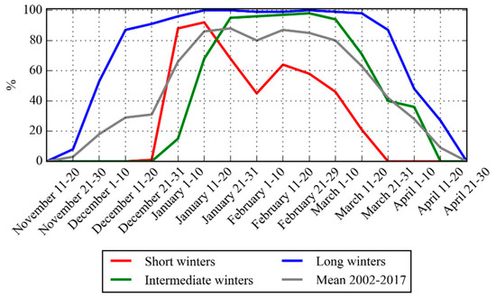 The 10-day averaged percentage of the ice cover extent in the Curonian Lagoon for the three winter categories.