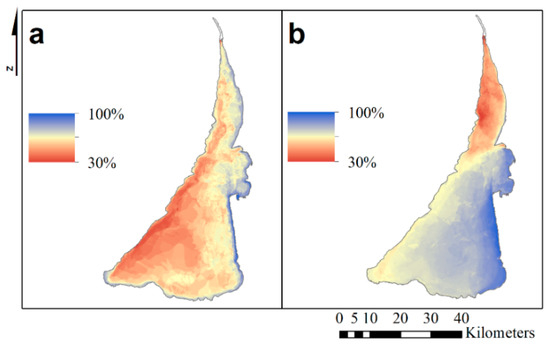 The spatial variations of the ice cover extent during (a) ice formation and (b) ice melting periods. The colors represent the percentage of ice observations during these periods, i.e., blue color in (a) shows the areas where the ice starts to form first, while the red color in (b) shows the areas where the ice melts first.