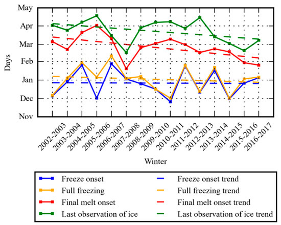 The interannual variability of the ice freeze onset, full freezing, final melt onset, and last observation of ice dates determined from the satellite data (solid lines) and their trends (dashed lines).