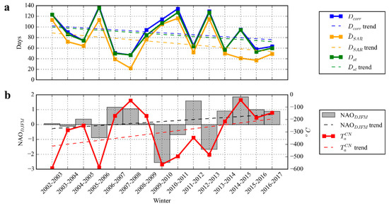 All fifteen winter seasons can be divided into three categories based on their values (listed in Table 2): Short winters with days (2006–2007, 2007–2008, 2014–2015, 2015–2016, and 2016–2017), intermediate winters with days (2003–2004, 2004–2005, 2008–2009, 2011–2012, and 2013–2014), and long winters with days (2002–2003, 2005–2006, 2009–2010, 2010–2011, and 2012–2013). Notably, the interannual variability of the ice season duration in the Curonian Lagoon correlates very well with similar results obtained for the Gulf of Riga [59].
