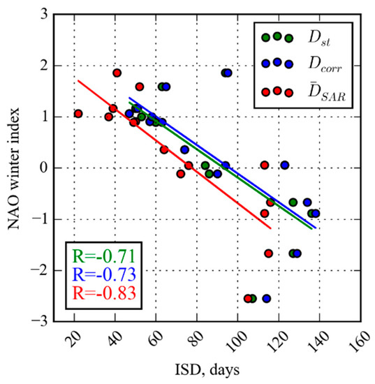 In order to determine the dependency of changes in the ice season duration on the intensity of the North Atlantic Oscillation (NAO), the correlation coefficient between the ice cover duration and Hurrell’s winter (December through March) NAODJFM index was calculated. The NAO data were obtained from the Climate Analysis Section, NCAR, Boulder, USA [54].