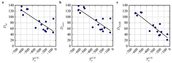 Scatterplots of the cumulative negative air temperature compared to the ice season duration (ISD) obtained from the coastal observations (a), maximum (b) and spatial-mean (c) ISD from the satellite data.