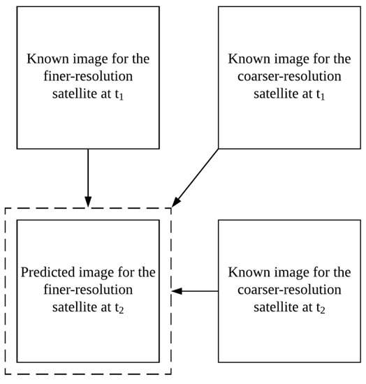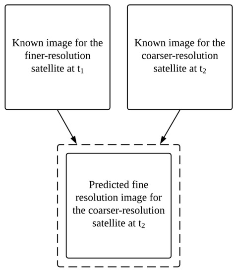 Although several methods have been developed about spatio-temporal data fusion, there are still some limitations due to stringent data requirements. The CNN fusion algorithm requires abundant data for training the relationship between fine and coarse satellite images. Some fusion algorithms [2,5,6,8,11] require at least two known fine and coarse image pairs, one before and one after the prediction date. This prerequisite prohibits near real-time applications, e.g., to derive real-time fine resolution satellite images based on real-time coarse images from geostationary satellites. In such applications, only images before the prediction time are known and therefore fusion algorithms requiring at least two known image pairs cannot be used. Although fusion algorithms requiring only one known image pair have recently been developed [3,7,12,16], they rely on the spatial correspondence between the fine and coarse resolution images. This only limits the fusion models to satellite platforms which have the same overpass times. However, in real applications, satellite images may not have the same overpass times and hence this poses a great challenge to the issue. In this paper, a new spatio-temporal data fusion algorithm, the Hopfield Neural Network SPatiotempOral daTa fusion model (HNN-SPOT) is developed, having the ability to use one fine resolution image at an arbitrary date and one coarse resolution image at the prediction date, to predict the fine resolution image at the prediction date using the optimization concept in the Hopfield neural network (HNN). An important merit of the HNN-SPOT is that it enables image fusion for satellites crossing the same geographic area with different overpass times. This method has a different concept to the existing one, as HNN-SPOT derives a synthesized fine resolution image for the coarser-resolution satellite at the prediction date, whereas existing methods derive a synthesized image for the finer-resolution satellite at the prediction date by utilizing the spatial relationship between the coarse and fine spatial resolution images at the known date. The difference of this new concept is depicted in Figure 1 and Figure 2.