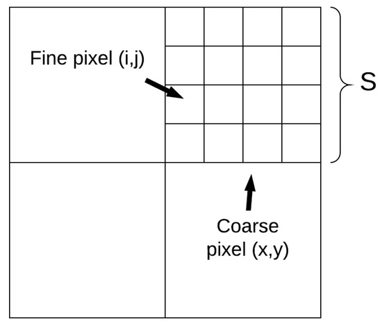 The term can be modeled using the spectral response in . Assuming that a coarse pixel represents the mean value of the fine pixels belonging to it: