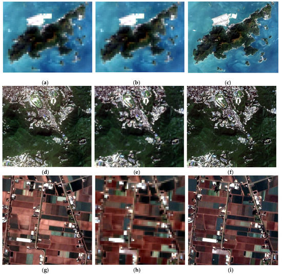 Simulated datasets: (a): Landsat 8 on 12/31/2013 (30 m) for study area 1; (b): Resampled Landsat 8 on 10/18/2015 (480 m) for study area 1; (c): Landsat 8 on 10/18/2015 (30 m) for study area 1; (d): Sentinel-2 on 1/1/2016 (10 m) for study area 2; (e): Resampled Sentinel-2 on 2/14/2017 (30 m) for study area 2; (f): Sentinel-2 on 2/14/2017 (10 m) for study area 2; (g): PlanetScope on 6/22/2018 (3 m) for study area 3; (h): Resampled PlanetScope on 5/31/2018 (30 m) for study area 3; (i): PlanetScope on 5/31/2018 (3 m) for study area 3.