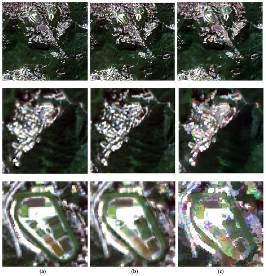 Fusion results for the Hong Kong Island on 14 February 2017, zoomed to a piece of the unchanged area with half urban and half vegetation cover (images in the 2nd row) and the racecourse with notable changes (images in the 3rd row). (a) Sentinel-2 at 10 m; (b) fused image at 10 m by HNN-SPOT; (c) fused image at 10 m by STARFM.