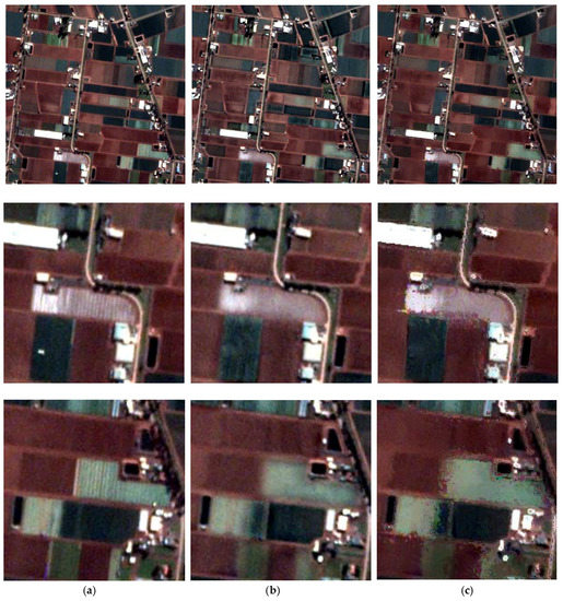 Fusion results for Werribee South on 31 May, 2018, zoomed to two changing fields (images in the 2nd row and the 3rd row). (a) PlanetScope at 3 m; (b) fused image at 3 m by HNN-SPOT; (c) fused image at 3 m by STARFM.