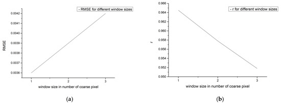 The (a) RMSE and (b) r of the fusion results with applying different window sizes (from 1 coarse pixel to 3 coarse pixels) in the HNN-SPOT algorithm.