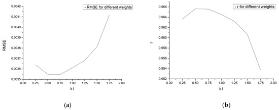 The (a) RMSE and (b) r of the fusion results with applying different weights for k1 and k2 in the HNN-SPOT algorithm.