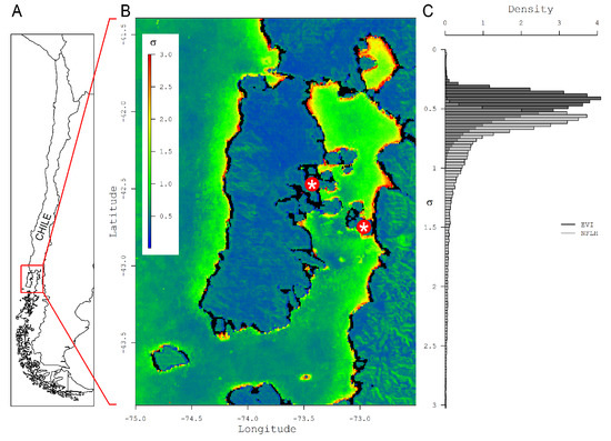 Study area: (A) Study area showing its location along the coast of Chile; (B) northern Patagonia Ecosystem coloured using the standard deviation of Enhanced Vegetation Index (land) and normalized fluorescence line height (water) from all available images over the 2003–2017 study period; (C) histogram of the standard deviation in EVI (black) and nFLH (gray). The full temporal series of images (2003 to 2017, for EVI and nFLH) was used to calculate one single image that contained the variability of both measurements. First, every image was standardized to work with both sets in the same units, using the formula . For EVI, the image was re-sampled to 1 km, to match the resolution of nFLH. Then, for every stack of images (EVI and nFLH), the standard deviation of every pixel trough time is calculated and a single image is generated for every product. Both images, the standard deviation for EVI and nFLH, are added in order to fill the land/water that both products do not cover. In all points where they overlap (coastal zones), the values were filled with null values. The main axis of Desertores Islands, are denoted by red asteriks.