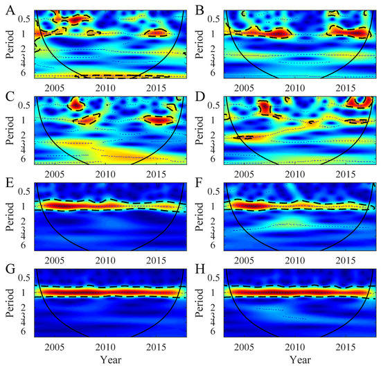 Wavelet Power Spectrum (WPS) showing the dominant periods (in years) of variability for the 2003–2017 time series. (A) Chl-a in the northern area; (B) Chl-a in the southern area; (C) nFLH in the northern area; (D) nFLH in the southern area; (E) EVI in the northern area; (F) EVI in the southern area; (G) SST in the northern area; (H) SST in the southern area. The black line defines the cone of influence above which computations are not influenced by edge effects. The colour code for power values is graded from blue (low power) to red (high power). The black dot–dashed lines indicate the 95% and 90% significant areas obtained by adapted bootstrapping [55].