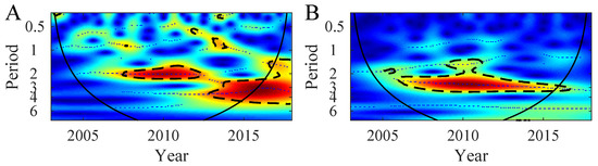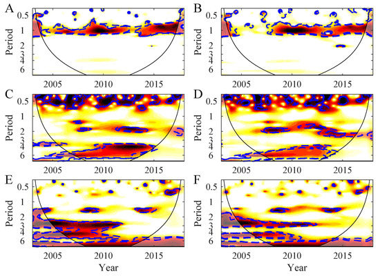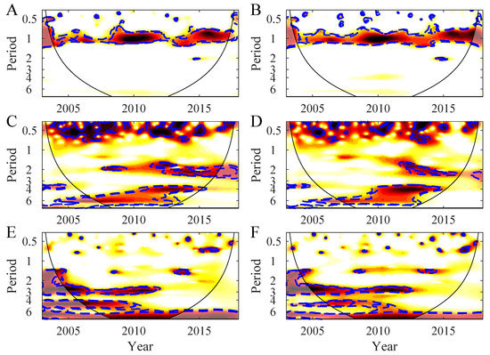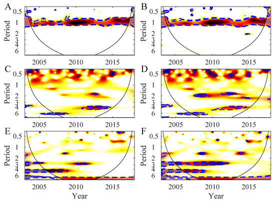 where denotes a smoothing operator in both time and space, is the wavelet co–spectrum of the two time series and , and and are the wavelet transform of the and , respectively. equals one when there is a perfect linear relationship at a specific time t and frequency f between the two signals, and equals zero if the time series are independent [9,52].