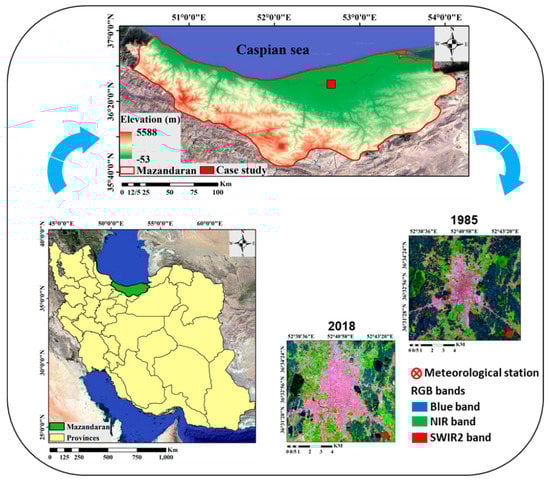 The study area included the City of Babol and its suburbs with an area of approximately 10,062 hectares (10.32 km × 9.75 km). Geographically, the study area is located between 52°37′31″ and 52°44′25″ E in longitude and between 36°30′14″ and 36°35′30″ N in latitude. It is distanced 15 km from the Caspian Sea, 20 km from the Hyrcanian forests, 45 km from the Alborz Mountains, and 210 km from the Tehran (capital of Iran). The study location is on the south side of the Caspian Sea, as shown in Figure 1. The average elevation of the study area is about 2 m below sea level with a temperate and humid climate. The minimum and maximum values of elevation and slope of study area are −3–10 m, and 0°–5°, respectively. For this reason, the spatial variation of climatic and topography parameters impacting on the spatial variations of LST is relative. The City of Babol is the most populated city in Mazandaran Province, and the second most populated city in northern Iran. The region’s population has grown by more than 20% from 1985 to 2017 [19]. The population growth has led to built-up expansion of the city and changed agricultural lands and green spaces around the city [50,51]. The results of previous studies indicate that the built-up land increased from 19% of the total area in 1985 to 36.52% in 2015. Land-use change predictions for the next 30 years indicate that the urban expansion will continue into the surrounding natural environments, and consequently, LST and biophysical parameters would also be affected.