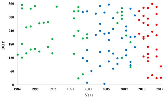 Landsat data for current study. Color code: Green, Landsat 5; Blue, Landsat 7; and Red, Landsat 8.