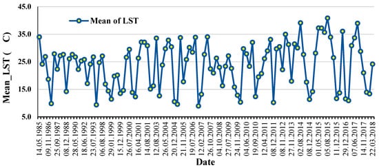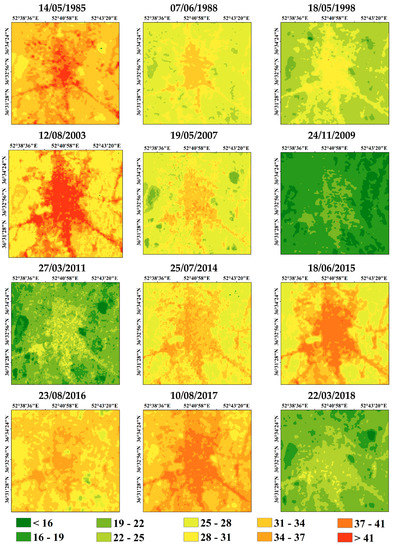 The correlation coefficient yielded 0.91 between Landsat-derived LST values and soil temperatures measured at the location of the meteorological station. Furthermore, the correlation coefficient between the mean LST obtained from Landsat and that from MOD11A1 reached 0.93. These results indicate that LST calculated with the Landsat images possessed a high accuracy. The RMSE parameter yielded 1.80 °C between the Landsat LSTs and the soil temperatures, and 1.37 °C between the mean LST from Landsat images and MOD11A1. According to previous studies [19,85,86], RMSE value of less than 2 °C between the mean LST obtained from Landsat and MOD11A1 indicates the high accuracy of LST derivation. Examples of the derived LST maps at different days from 1985 to 2018 are shown in Figure 5. The results indicated that LST values increased over the years of studied period.