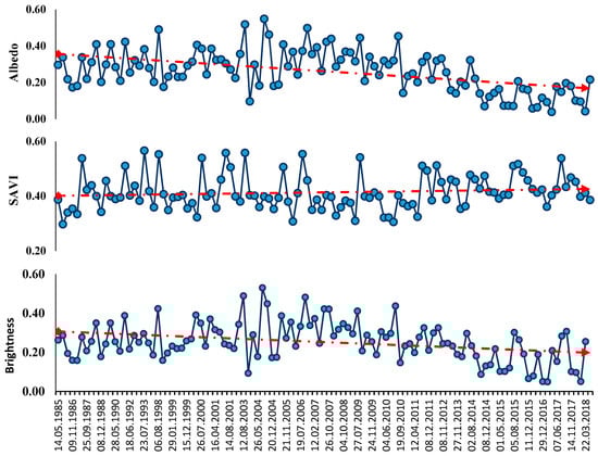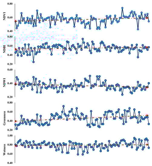 According to Figure 7, the mean normalized values for the surface biophysical parameters varied significantly in the period of 1985–2018. The standard deviation of the mean values of the NDVI, NDBI, NDWI, greenness, wetness, albedo, SAVI, and brightness are 0.0718, 0.086, 0.074, 0.115, 0.075, 0.1135, 0.067, and 0.098, respectively. The correlation coefficient between the observed mean values of the normalized LST (NLST) and mean normalized values of the surface biophysical parameters are shown in Table 2.