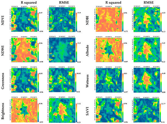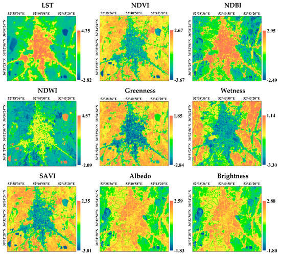 The results of Table 3 indicate that among the spectral indices considered for the surface biophysical parameters of the vegetation cover, impervious surface cover, and wetness surface cover, the variation in the greenness (from the group of biophysical parameters related to vegetation covers), NDBI (from the group of biophysical parameters related to impervious surfaces), and wetness (from the group of biophysical parameters related to wetness surfaces) have the highest effect on the LST variations, respectively. Based on the RMSE between the observed and modeled values of LST variations at the pixel scale for greenness, NDBI, and wetness variations (Figure 10), the results of the spatial distribution of the most effective biophysical parameter variations on LST variations are shown in Figure 11.