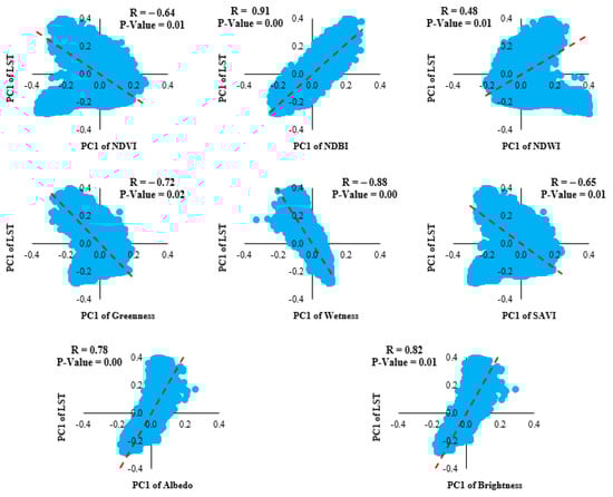 In general, the value of LST decreases with increasing surface brightness (NDBI, albedo, and brightness from TCT components) and reduced vegetation (NDVI, SAVI, and greenness from TCT components) and the moisture (NDWI and wetness from TCT components) on the surface, and vice versa [16,33,87]. A negative relationship was found between vegetation and moisture indices and LST, which was most likely due to the effect of surface thermal inertia and evapotranspiration [3,36]. However, according to Figure 10, there was a direct relationship between the LST variations and greenness variations in some regions. According to previous studies, there is an inverse relationship between the LST variations and the vegetation variations [7,33]. In areas where there is a positive relationship between the LST variations and the vegetation variations, this may be due to the high impact of other surface biophysical parameters variations on the LST variations. In addition, the relationship between the LST variations and NDBI variations is supposed to be direct [23]. However, according to Figure 10, the relationship between these two parameters is negative in some region of the case study; this is indicative of the higher impact of some other surface biophysical parameters, such as greenness and wetness, on the LST variations in these regions. For this reason, simultaneous investigation of the relationship between the variations in surface biophysical parameters variations and LST variations is compelling [3,13,32]. Using multivariate OLS regression, it is possible to consider the influence of several independent parameters on a dependent parameter. In the present study, through the simultaneous consideration of the PC1 of the three surface biophysical parameters (NDBI, greenness, and wetness) and the PC1 of the LST, the impact of a set of surface biophysical parameters on LST variation was investigated (Figure 12 and Figure 13).