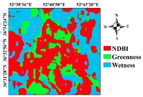 Figure 9 indicates that among the spectral indices considered, the variations in the greenness from TCT components (from group of biophysical parameters related to vegetation covers), NDBI (from group of biophysical parameters related to impervious surfaces), and wetness from TCT components (from group of biophysical parameters related to wetness surfaces) have the highest impact on the LST variations, respectively. Based on regional optimization, among the various surface biophysical parameters, NDBI variations had the highest impact on the LST variations. The results of the initial investigation indicate that in this study area, variations of NDWI and NDBI have the lowest and the highest impact on the LST variations, respectively (Figure 9). The correlation coefficient between the LST and NDBI was high [36].