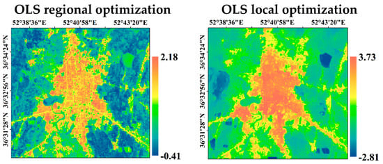 Modeled LST variations based on NDBI, greenness, and wetness variations using multivariate OLS regression with regional and local optimizations are shown in Figure 12.