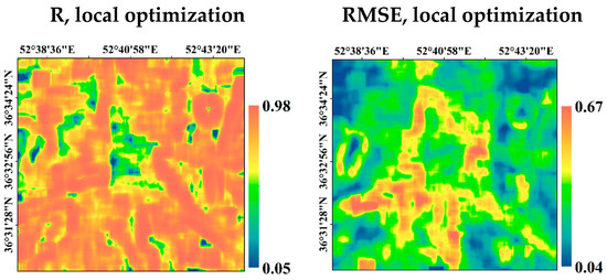 The results of the correlation coefficient and RMSE between the observed and modeled values of the LST variations based on the spatial moving window method are shown in Figure 10 and Table 3. The results indicated the values of the correlation coefficient and RMSE between the observed and modeled values of LST variations are variable spatially.