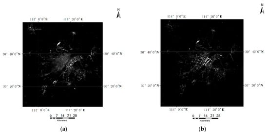 City lights of Wuhan by Luojia1-01. (a) Cloud-contaminated, (b) cloud-free.