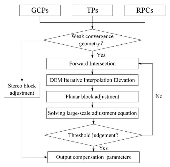 In response to this problem, we propose the planar block adjustment method, which only calculates the orientation compensation parameters of the satellite image and the ground planar coordinates of the TPs. The elevation value of the TPs is interpolated using a digital elevation model (DEM). This method ensures the stability and accuracy of the adjustment solution. The detailed planar block adjustment technical flowchart is presented in Figure 3.