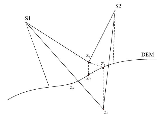 Referring to Figure 4, S1 and S2 are a pair of TPs of the same name point. In adjustment calculation, we took the average elevation value Z0 corresponding to the two points as the initial value and obtained the compensation amount of elevation after adjustment. Then, the initial elevation value Z0 was compensated to obtain Z1. Due to the weak convergence geometry of Luojia 1-01 nighttime light imagery, the elevation error caused by Z1 was amplified, and the adjustment result could not be converged. Therefore, the new elevation value Z’1 was obtained based on DEM interpolation to replace Z1 in the next adjustment iteration calculation. In this way, the new interpolated elevation value Z’2 was obtained, and the iterative calculation continued until the adjustment convergence.