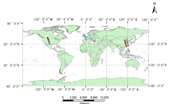 According to the nighttime light image matching algorithm, the four-track data of the Luojia1-01 images covering North America, Europe, and Asia were selected randomly to perform matching experiments and the robustness and matching accuracy of the algorithm are assessed. Figure 5 shows the distribution of the four-track data.