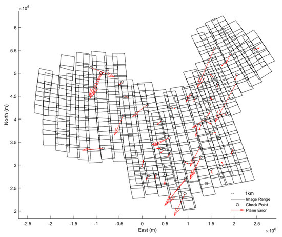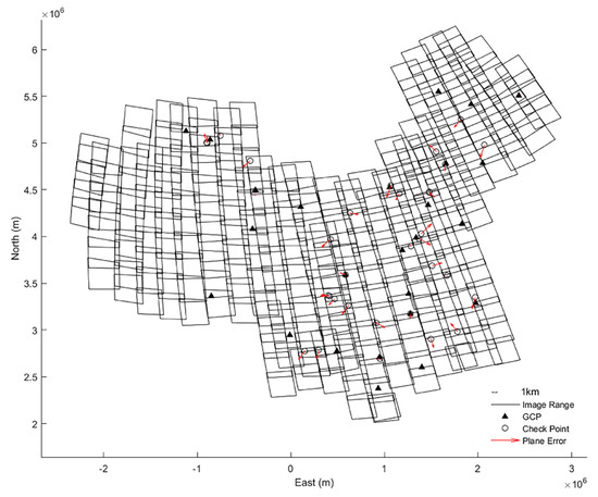 When the angle of intersection between satellite images participating in the block adjustment is small (less than 10°), the satellite images are generally known to have weak convergence geometry between adjacent images [36]. Therefore, the traditional stereo block adjustment method cannot be applied directly.