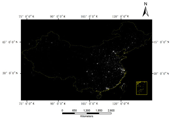 Nighttime light map of China using Luojia1-01 images. The yellow box in the lower right corner shows a schematic view of the South China Sea.