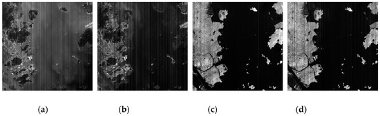 The parameters in the model are set according to the experiment result, and the weight coefficients of each energy term are adjusted appropriately according to the application requirements. Experimental results show that the parameters of the model in this paper are set as follows: In the adaptive moment matching algorithm, pb = the mean gray value of water area for each band, and when the column belongs to a high-brightness region, Wmax = cols / 3, otherwise, Wmax = cols / 4. In the variational algorithm, λ1 = 10, λ2 = 1, λ3 = 0.1, α = 1000, β = 100, γ = 10, and the maximum iteration number of multi-level decomposition = 10, and the maximum iteration number of internal unidirectional total variational = 20, and the termination condition of the iteration is ||uk+1-uk||2/||uk||2 < 1 × 10−4. In the piecewise linear least squares model, we set t1 = 10, t2 = 20 when the color depth is 10-bit.