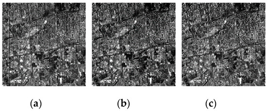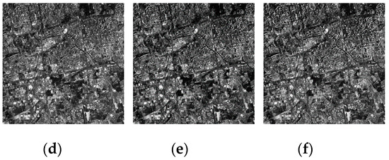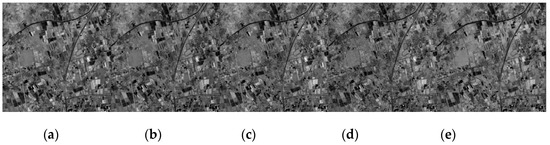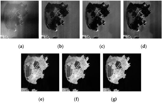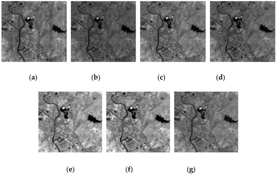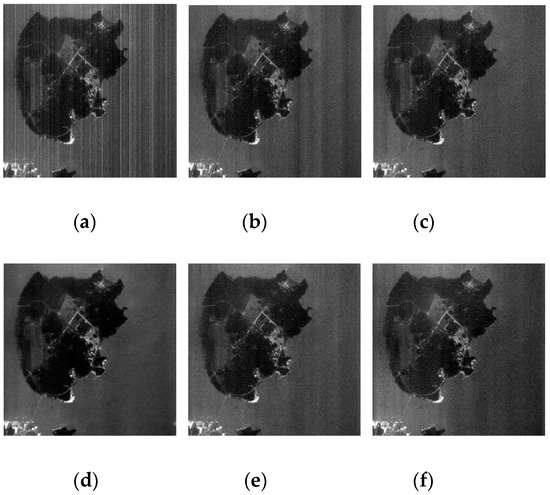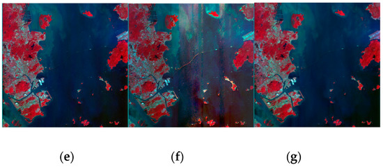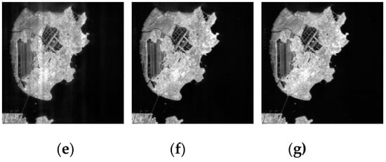 From Figure 19, Figure 20, Figure 21, Figure 22 and Figure 23 we can observe that ASSTV, LRMID and LRTD cannot remove all bands of stripe noise completely. When the noise level of different bands varies greatly, ASSTV, LRMID and LRTD cannot take into account the situation of all bands, so that it cannot remove all of the stripe noise or cause the loss of image details. For example, when we use LRMID to remove stripe noise, because the noise of some bands [Figure 19b,C] is very serious, when regularization parameters are adjusted to completely remove the noise of these bands, new horizontal stripe noise will be generated in other bands [Figure 21a,f,g]. But when we adjust the regularization parameters so that these bands can remove the stripe noise without producing artifacts, some bands with serious noise cannot completely remove the noise [Figure 21b𠄽d]. However, our method firstly weakens the image stripe noise adaptively, which can take into account the different noise levels of all bands, so we obtain satisfactory results [Figure 23].