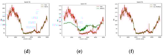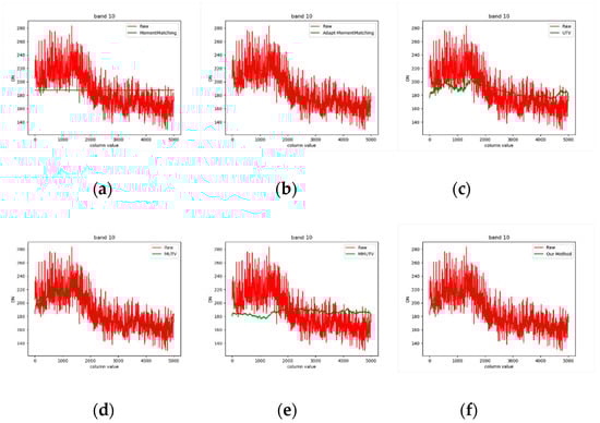 Spectral curve result of OHS (water). (a) Original image and moment matching spectral curve; (b) original image and adaptive moment matching; (c) original image and unidirectional total variational (UTV); (d) original image and MUTV; (e) original image and MMUTV; (f) original image and our method.
