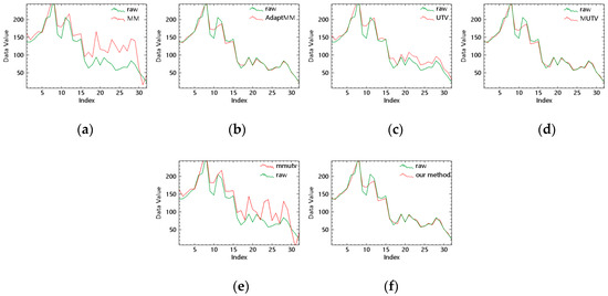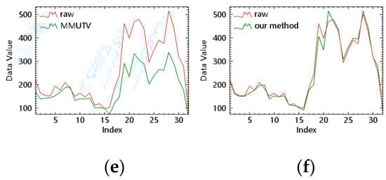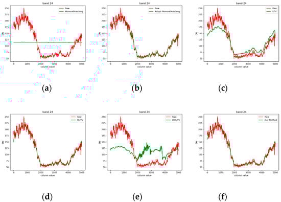 Spectral curve result of OHS (vegetation). (a) Original image and moment matching spectral curve; (b) original image and adaptive moment matching; (c)original image and UTV; (d) original image and MUTV; (e) original image and MMUTV; (f) original image and our method.