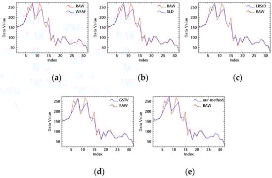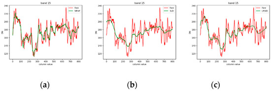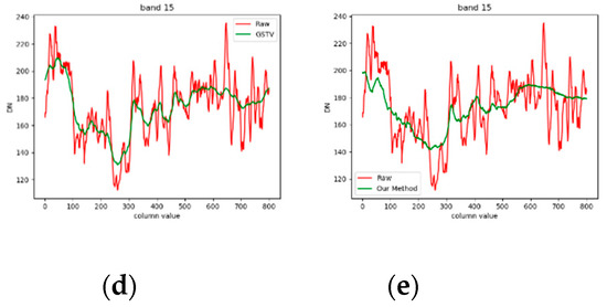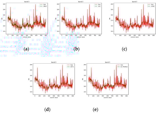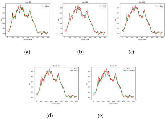 Figure 27 shows the comparison of the spectral curves of vegetation of hyperspectral images. Since the method of hyperspectral stripe noise removal comprehensively considers the spectral correlation, the corrected spectral curve is not completely consistent with the original curve. Among them, LRTD makes the spectral curve too smooth, thus damaging its spectral information, and destroying the correlation between the first 15 bands. LRSID well maintains spectral correlation, but it cannot completely remove noise. Since our corrected curve is the same as the original curve, the spectral information of all bands is well preserved. Although the spectral information of some bands deviates from the original one, most of the spectral information is also preserved.
