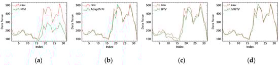 According to the water and vegetation spectral curves, the moment matching [see Figure 24a and Figure 25a] and MMUTV [see Figure 24e and Figure 25e] have a large change of the water and vegetation spectral curves. The UTV method [see Figure 15c and Figure 24c] affects the peaks of some bands, and the corrected vegetation spectral curve was lower than the original one. Other methods can better maintain the original spectral curve. The peaks and troughs of the waves are consistent with the original ones.