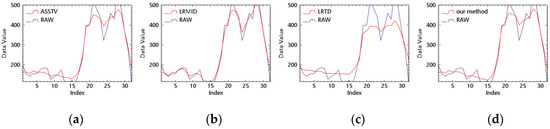 Spectral curve result of OHS (vegetation). (a) Original image and ASSTV spectral curve; (b) original image and LRMID; (c) original image and LRTD; (d) original image and our method.