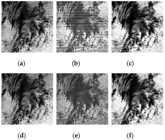 MODIS raw data and corrected data. (a) Original image of band 8; (b) original image of band 10; (c) original image of band 14; (d) corrected image of band 8; (e) corrected image of band 10; (f) corrected image of band 14.