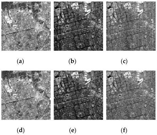 CHRIS raw data and corrected data. (a) Original image of band 1; (b) original image of band 2; (c) original image of band 3; (d) corrected image of band 1; (e) corrected image of band 2; (f) corrected image of band 3.