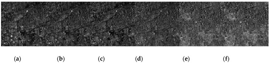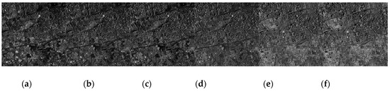 CHRIS corrected data. (a) Corrected image of band 1; (b) corrected image of band 4; (c) corrected image of band 7; (d) corrected image of band 10; (e) corrected image of band 13; (f) corrected image of band 16.
