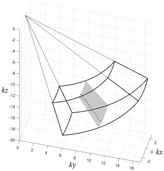 Geometrical loci associated with the wavenumbers illuminated by a typical airborne SAR system. A small target, observed from a fixed azimuth position, is associated with the dashed segment here shown: the distance from the origin being proportional to the radar central frequency, its length to the system bandwidth and its orientation following the segment connecting sensor and target (the local line-of-sight). The set of segments associated with every position of the sensor within the synthetic aperture is shown as a gray surface. The set of patches associated with all the off-nadir angle explored by the physical antenna gives rise to the volume whose edges are shown as thick lines.