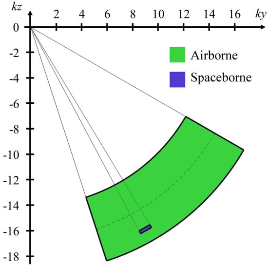Airborne systems usually flight between ∼2 km and ∼10 km of altitude thus resulting in a wide range of look angles within the swath; as a general rule, near range targets are associated with look angles of about reaching in far range, this values being mainly determined by the antenna beamwidth in the elevation direction. On the contrary, the swath width of a spaceborne system shall be set according to the need of avoiding undesired ambiguous echos and nadir returns. These constraints together with the large distances at stake lead to a very small range of look angles; as a rule of thumb, it may change by from near to far range. These features impact on the spectral region illuminated by the two systems in the domain. Figure 4 shows the wavenumbers excited by an airborne system (in green) and a spaceborne one (in purple). With respect to the airborne, the spaceborne system here considered has a higher carrier frequency but a much lower bandwidth. The dashed line in Figure 4 shows the wavenumbers associated with the carrier frequency as the acquisition moves from near to far range. Its distance from the origin is constant and expressed by Equation (3) whereas its rotation depends exclusively on the geometry of acquisition. According to this, a polar system of coordinates turns out to be particularly helpful in this context; the relationship between the two coordinate systems are expressed by Equations (8)–(10).