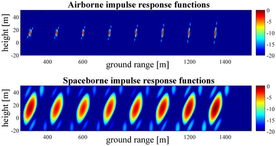 A comparison between the impulse response functions (that is, the point spread functions) of airborne and spaceborne systems is shown in Figure 5 for difference range values.