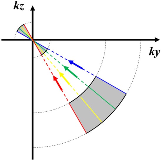 The interaction between wave and target generates a set of waves scattered in all directions. In this discussion only the waves traveling back to the radar are considered, that is, only the monostatic case is analyzed. The two-way travel path implies that the wavenumbers of the target responsible for the backscattered echo are twice the ones of the signal impinging on the target itself [20]. Then, the spectral components giving rise to the radar echo, lie on a line centered on and with length ; these latter quantities are defined by Equations (3) and (4).