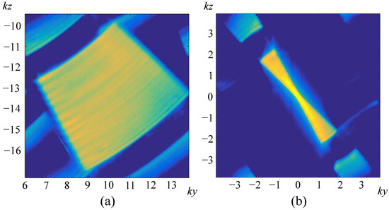 where represents the distance of each pixel of from the master sensor and the central wavelength used by the airborne system. The product between and modifies the spectral support of the reflectivity function and takes it into baseband. Locally, that is for every look angle, it amounts to a translation of the corresponding spectral line along the direction defined by the spectral line itself; however, different look angles are associated with spectral lines with different orientations so that the translation always follows the radial direction. As a consequence, the shape of the spectral support of is modified: from a section of a ring to a “butterfly” shaped region as shown in Figure 6. The thickness of the butterfly around the origin in the direction orthogonal to the line-of-sight is connected to the resolution of the reflectivity map along the cross-range direction that the airborne system is able to provide. Real spectra before and after the spatial demodulation are shown in Figure 7. The reflectivity profile can be taken in the surrounding of the wavenumbers illuminated by the spaceborne system by another modulation; the modulating map is shown in Equation (14).