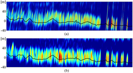 Tomographic profiles returned by the back-projection algorithms when applied to (a) real airborne data and (b) simulated spaceborne stack. The two axes are analogous to the ones shown in Figure 5; the black line shows the ground topography below the forest layer estimated through SAR tomography [25].