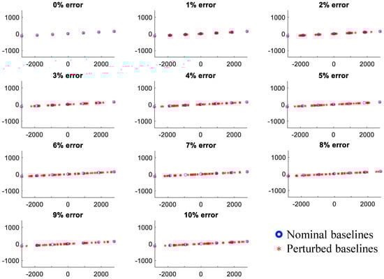 Sensor positions in the zero Doppler plane of the simulated spaceborne system; regularly spaced (nominal) positions are shown as blue circles, irregular positions as red asterisks. The irregular coordinates have been obtained by modifying the nominal positions with a Gaussian perturbation, the elevation above the Earth surface being kept constant. The amount of perturbation is defined by the standard deviation of the Gaussian noise as a percentage of the total baseline aperture. In this work, 11 perturbations have been tested from to . The corresponding sampling of the total baseline aperture is shown in the 11 panels here shown.